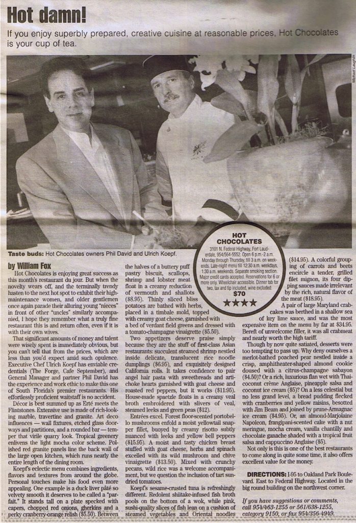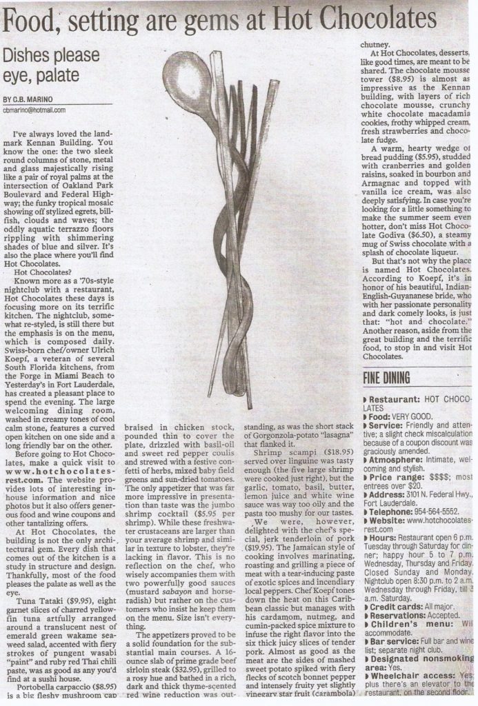 Hot Chocolate does not always have to be a beverage, it can also be a Restaurant and Entertainment-Night Club as this one was. A concept created by Steve Vincent, Back in 1997, this was a project I was involved in with him. Located on the corner of Oakland Park Boulevard and North Federal Highway in Fort Lauderdale, Florida, this hot spot was a great concept featuring an open kitchen, a beautiful Bar & Lounge, and a Private Dining Room for 12 people. Adjacent to the restaurant was a Night Club with a 15-piece live band, the dance floor in the center was surrounded by 3 large bars. We accrued many accolades for the food and service during the 5-year run after that, in 2001, the business was sold.